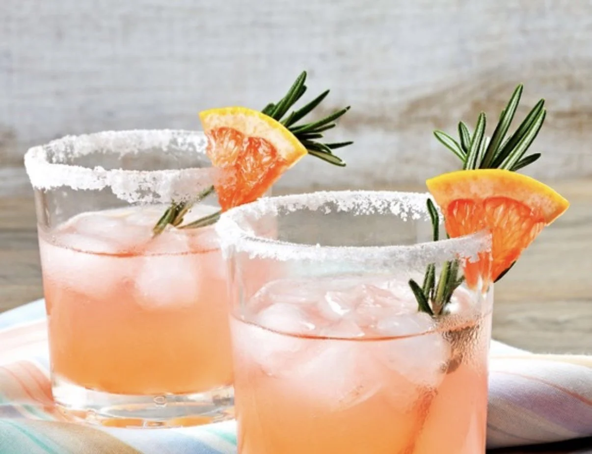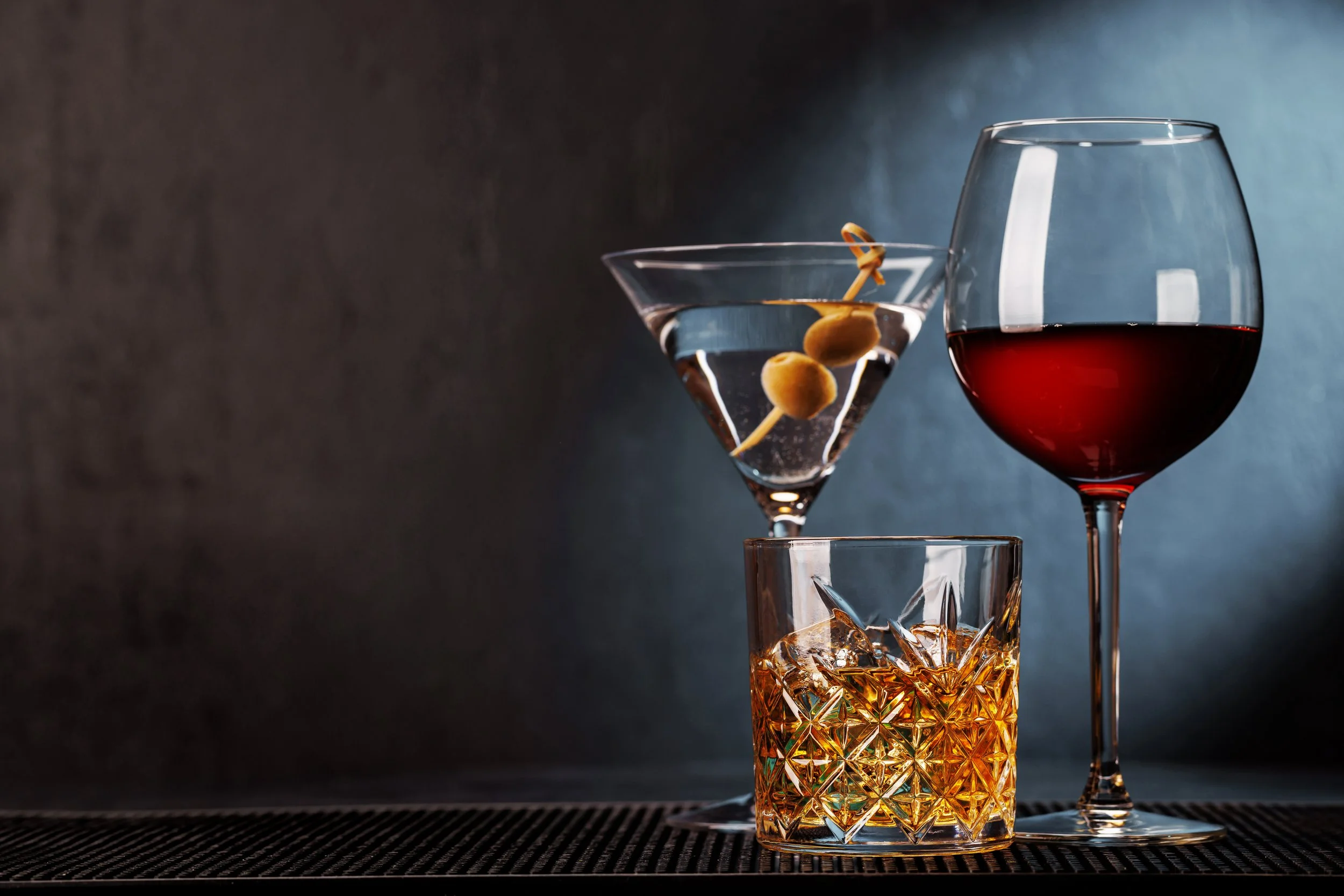 Assorted drinks: a whiskey glass with ice, a martini with olives, and a red wine glass on a bar counter.