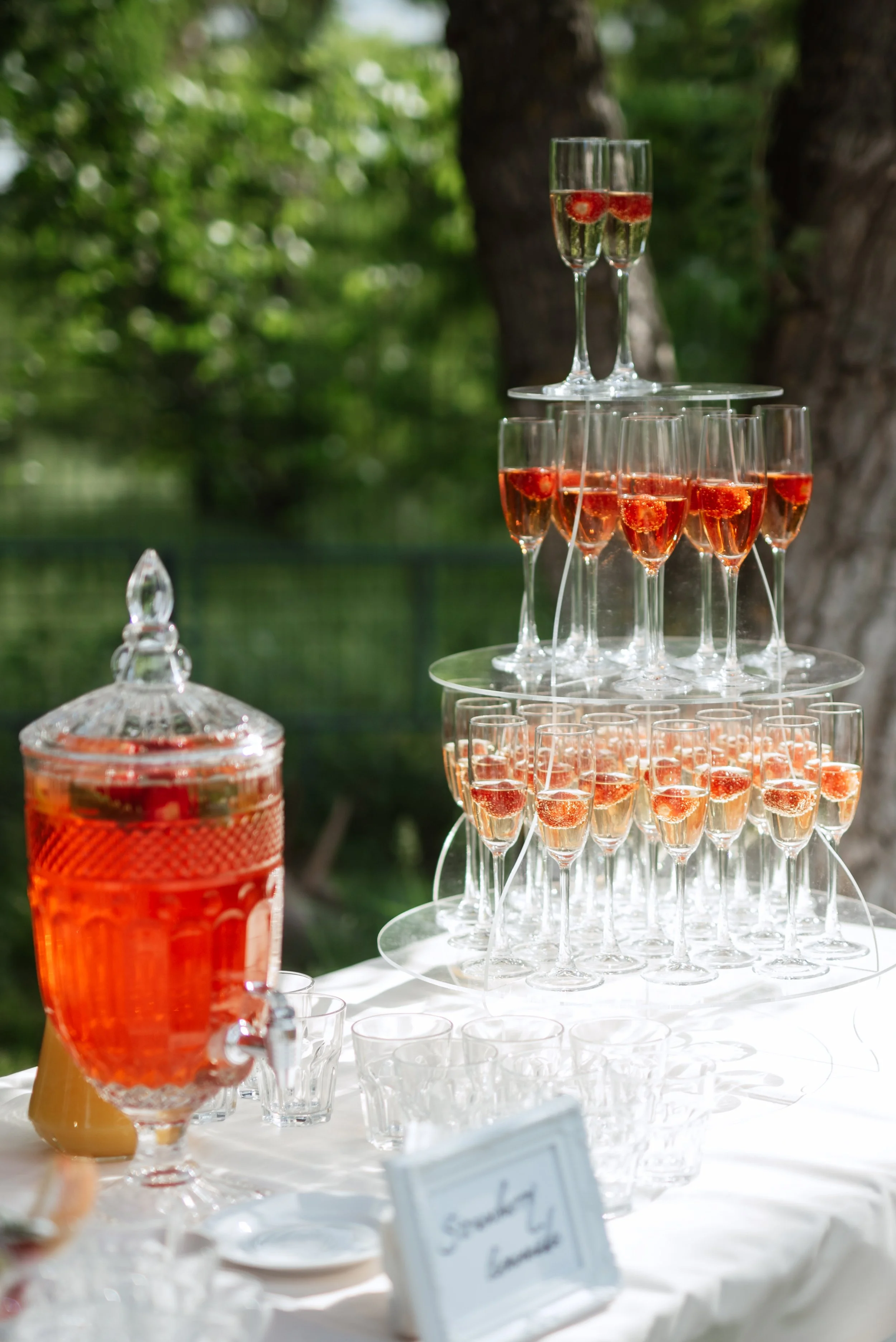 Champagne glasses with strawberries tiered on a stand, next to a glass beverage dispenser filled with red drink on a table.